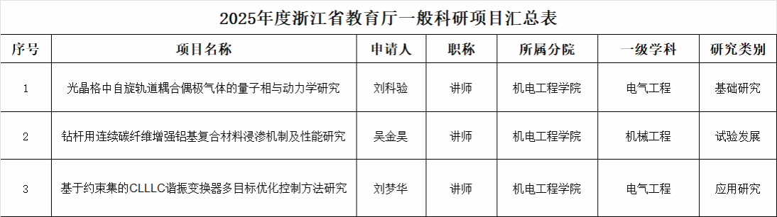 根据学校科研处《关于开展2025年省教育厅一般科研项目申报的通知》要求,经个人申报、校外专家评审等环节,拟推荐以下3个项目申报2025年度浙江省教育厅一般科研项目,现予以公示如下: