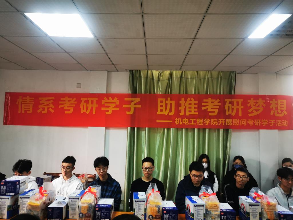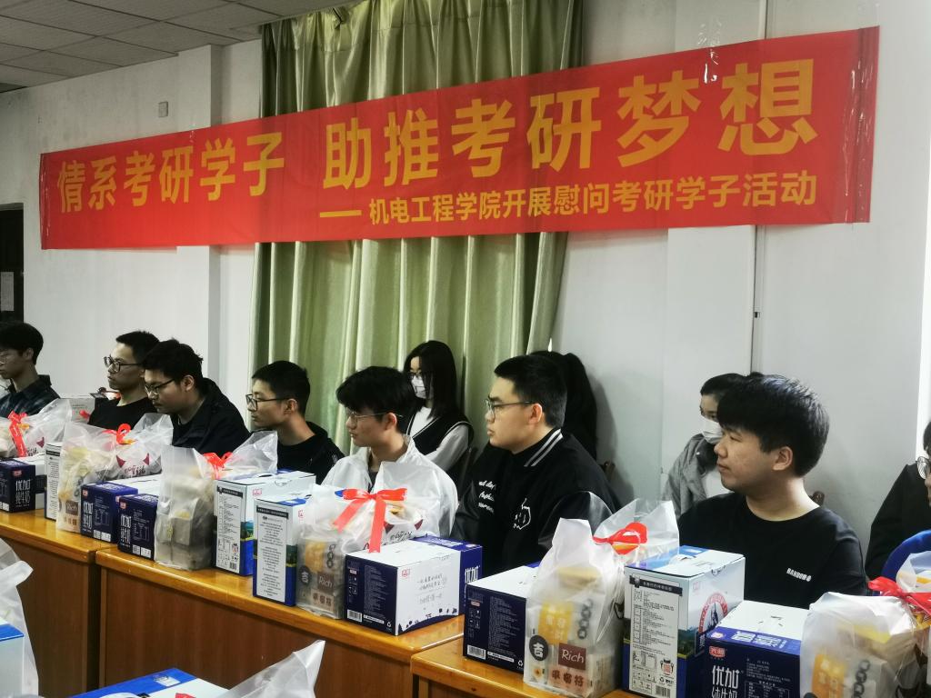 机电工程学院一直高度重视毕业生考研工作,在思想、学习和生活等方面为考研学生提供指导和帮助,并通过广大考研学生的示范效应在学生中积极营造浓郁的学习氛围,有力促进了机电工程学院优良学风的形成和发展。会议结束后,与会人员向大家发放了慰问品。