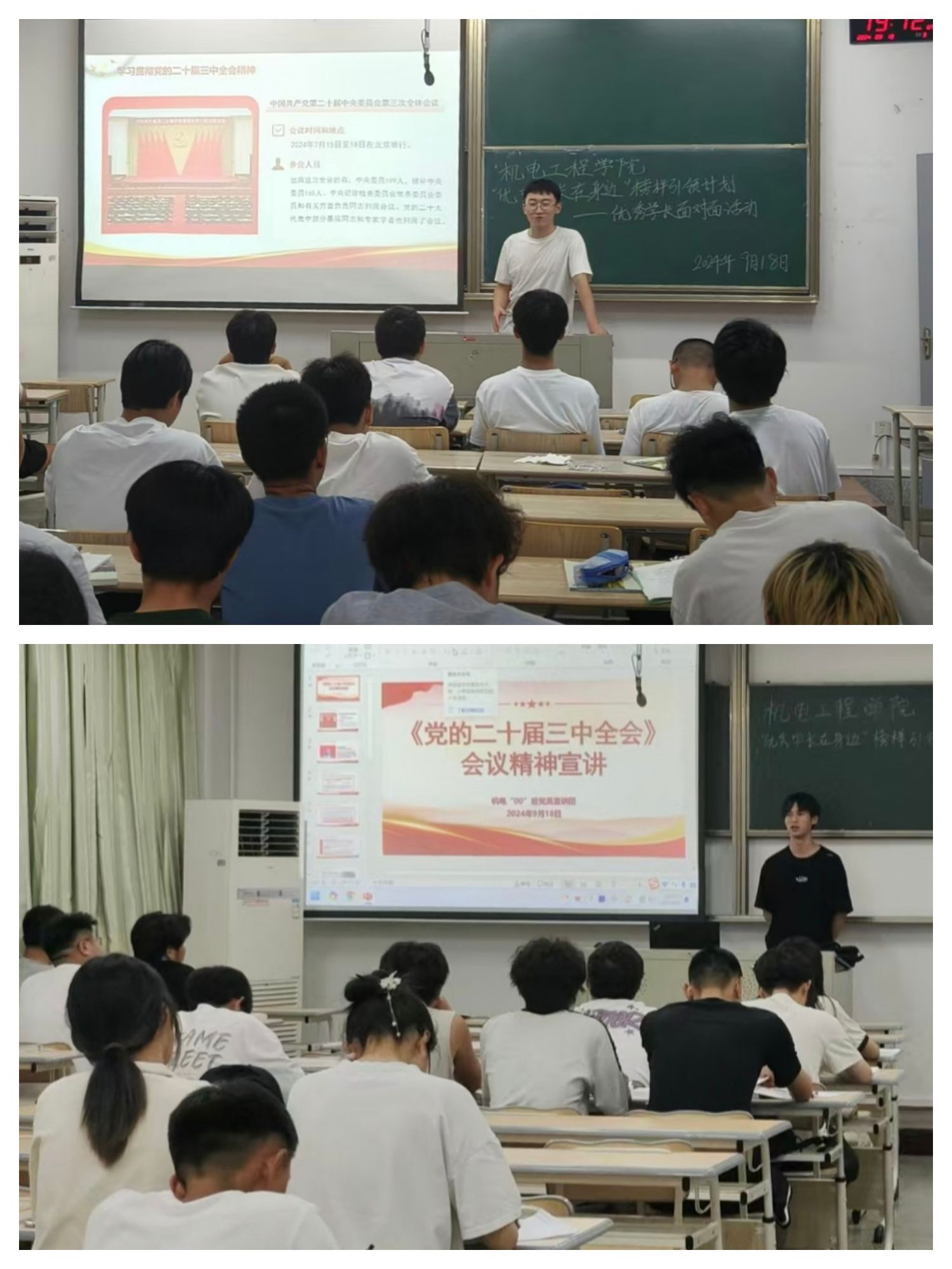 为深入学习贯彻党的二十届三中全会精神,增强青年学子的责任感与使命感,9月18日晚,机电工程学院“00后党员宣讲团”面向24级新生团支部开展了“党的二十届三中全会”主题宣讲活动。